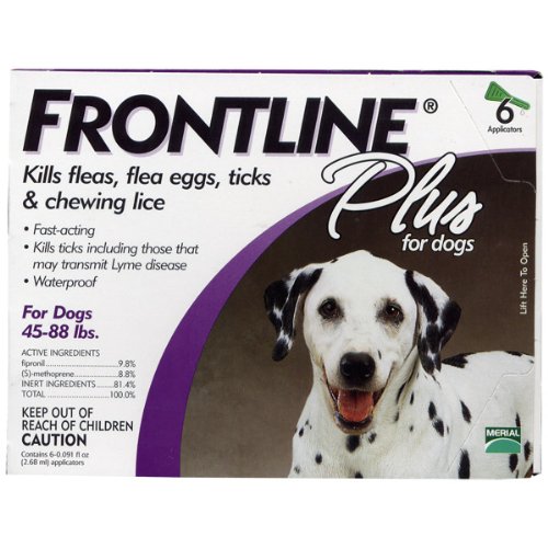 For dogs & puppies 8 weeks or older and 45-88 pounds. Kills fleas, flea eggs, ticks & chewing lice. Fast acting. Kills ticks including those that may transmit Lyme disease. Waterproof. Package contains (6) 0.091 fl oz (2.68 ml) applicators. Directions for Use: To kill fleas, all stages of brown dog ticks, American dog ticks, lone star ticks, and deer ticks (which may carry Lyme disease) and chewing lice, apply to dogs or puppies (8 weeks or older) as follows: Remove applicator from child resistant package. Hold applicator upright and snap applicator tip away from face and body. Place applicator tip through animal's hair to the skin level between the shoulder blades. Squeeze applicator, applying entire contents in a single spot to the animal's skin. Avoid superficial application to the animal's hair. Only one applicator per treatment is needed. Frontline Plus aids in the control of sarcoptic mange infestations. Multiple monthly treatments are recommended for the elimination of mites. Frontline Plus for dogs can also be used for the treatment and control of flea, tick and chewing lice infestations on breeding, pregnant and lactating bitches. Frequency of Application: When used monthly, Frontline Plus for dogs completely breaks the flea life cycle and controls tick and chewing lice infestations. Research demonstrates that Frontline Plus kills adult fleas, flea eggs, and flea larvae for up to six weeks. Frontline Plus also prevents development of all flea stages for up to six weeks. Frontline Plus kills ticks for at least one month. A once monthly application is recommended where tick control is needed. Although Frontline Plus can control fleas for up to six weeks, if there is a high risk of re-infestation or if the pet has fleas which may cause flea allergy dermatitis, a once monthly application may be needed.Discount "Frontline Plus for Dogs - 6 count - Dogs 45-88 lbs" For Sale.